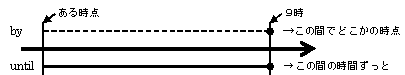 このことを図にすると次のようになります。真ん中の矢印は時間の流れをあらわしています。「by」の点線はどこでも切ってよいことを意味し、「until」の実線は継続しなければならないことを意味します。