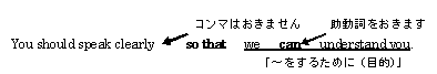 ¡¡¤¿¤È¤¨¤Ð¡¢You should speak clearly so that we can understand you.¤Ï¡Ö»ä㤬Íý²ò¤Ç¤¤ë¤è¤¦¤Ë¤¢¤Ê¤¿¤ÏÌÀ³Î¤ËÏ乤ۤ¦¤¬¤¤¤¤¤Ç¤¹¤è¡£¡×¤È¤¤¤¦Ê¸¤Ë¤Ê¤ê¤Þ¤¹¡£