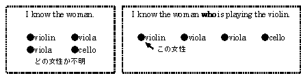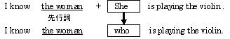 ¡¡I know the woman.¤Ï¡Ö»ä¤Ï¤½¤Î½÷À¤òÃΤäƤ¤¤Þ¤¹¡£¡×¤È¤¤¤¦Ê¸¤Ç¤¹¤¬¡¢¤³¤ì¤À¤±¤Ç¤Ï¤É¤Î½÷À¤Ê¤Î¤«¤¬¤Ï¤Ã¤¤ê¤·¤Þ¤»¤ó¡£¤½¤³¤ÇI know the woman who is playing the violin.¤Î¤è¤¦¤Ë´Ø·¸Âå̾»ì¤Ç½¤¾þ¤¹¤ë¤³¤È¤Ç¤É¤Î½÷À¤Ê¤Î¤«¤ò¤Ï¤Ã¤¤ê¤µ¤»¤ë¤³¤È¤¬¤Ç¤¤Þ¤¹¡£