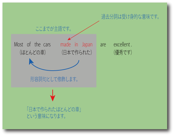 この文の「Most of the cars made in Japan」までが主語です。「made」以下の語は形容詞句として「Most of the cars」を修飾します。