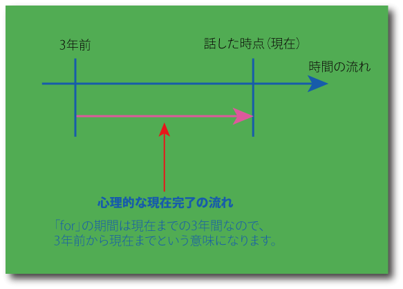 たとえば I have lived here for three years.「私はここに3年前から住んでいます。」を例にしてみます。