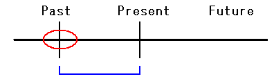 | 3.1.2. Continuous This usage means the event which is occurred certainly in the past has the duration to the present. (10) a. We have lived in Hakodate for five years. b. The house has been empty for ages. (10a) means living for five years from a certain past to the present. (10b) is the same. In the above, "for" is used, it means a period and it is often used with the continuous usage. And "since" is also used, because it means the starting point and has the duration. See the figure of PrPF. (11) ![]() The above is shown in the previous section. The red circle means the event and the blue line means the speaker's feeling. But the red circle can be changed into the following by the continuous meaning. (12) ![]() The red line which was the red circle means the duration from a certain past to the present.