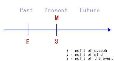 | 3.1.2.1. Perfective and Resultative This expresses the events which are completed in the recent past. Although the event is obviously the past, the speaker treats it as the present. Moreover, when some results are left, it is called the Resultative usage, and if not, it is called the Perfective usage. (3) a. The clock has just struck ten. b. The river has frozen. If the above is classified into the two, (3a) is Perfective and (3b) is Resultative. Nothing is left in (3a), but the result of the freeze is left in (3b). The two has some different meanings but it is often difficult to classify. And both of them express the recent past, therefore in this text, the two is explained as the one usage. See the following figure. (4) ![]() This can also be represented as follows. (5) ![]() In the above, E is close to the present. Especially, (3b) is parallel to it. It is unknown when the present perfect form (PrPF) is not used, does it depend on the place of E? No, it depends on the speaker's mind. See the following examples. (6) a. She has just left. b. She has just arrived. We do not know the time. (6a) means before 5 minutes or 30 minutes? and (6b) means before one minute or one hour? The speaker does not consider the event time point, s/he has the relationship with the present. See the following figure revised for this usage. (7) ![]() If the event is occurred in the oblique line in the above, the speaker has the present. This is also seen as follows. (8) ![]() This expresses the three events in the past. Some people treats the three as PrPF, but another treats (2) and (3) as PrPF and (1) as the past tense. It depends on the speaker's mind. Now, "The river has frozen. (3b)" might be not considered the recent past. It needs some time to freeze. But the speaker does not have the frozen time point in mind, s/he has the frozen result in the present. See the following examples. (9) a. My watch has stopped. b. He has received a good education. In (9a), the stopping time is unknown. The speaker understands the event obviously occurred in the past, but s/he puts own focus on the point of the stopping result time when s/he perceives. Moreover, (9b) is the same. The speaker does not put the focus on his leaning time, but puts it on the leaning result time in the present.