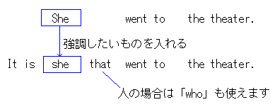また、「the theater」を強調したい場合は次のようになります。 It is the theater that she went to.(映画館です、彼女が行ったのは。) ![]()