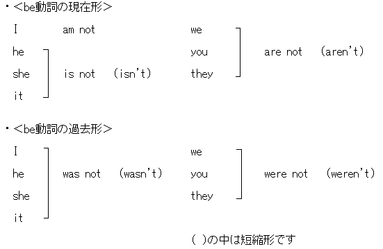be動詞の後に、否定を表す「not」を続けます。![]() They aren't Japanese.(彼らは日本人ではありません。) I wasn't hungry.(私はおなかがすいていませんでした。)