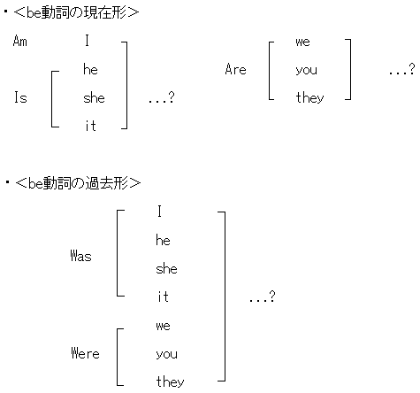 be動詞の疑問形は主語とbe動詞の語順を逆にしてから、文の最後に「?」を続けます。![]() Is it cold?(寒いですか。) Are you tired?(疲れていますか。) Was she at work yesterday?(彼女は昨日仕事をしましたか。) Were they expensive?(それらは高かったですか。) |