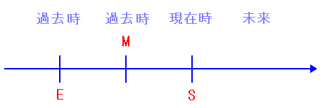 仮定法過去完了も時間表示としては仮定法過去と同様に例外的となる。 その形式だけから時間表示を考えた場合は、(9a)のようになる。 しかし、実際は心の位置(M)と出来事時(E)の2点は、発話時(S)から1つだけ離れた過去時に重なることになる。さらに以前の時点を示す過去時に、仮の出来事時を表す(E)を置くことになる。こうして考えられる時間表示が(9b)である。 以上だが、形式的な性格を持った表現である。ゆえにこの形式は用いられることが少ない。
